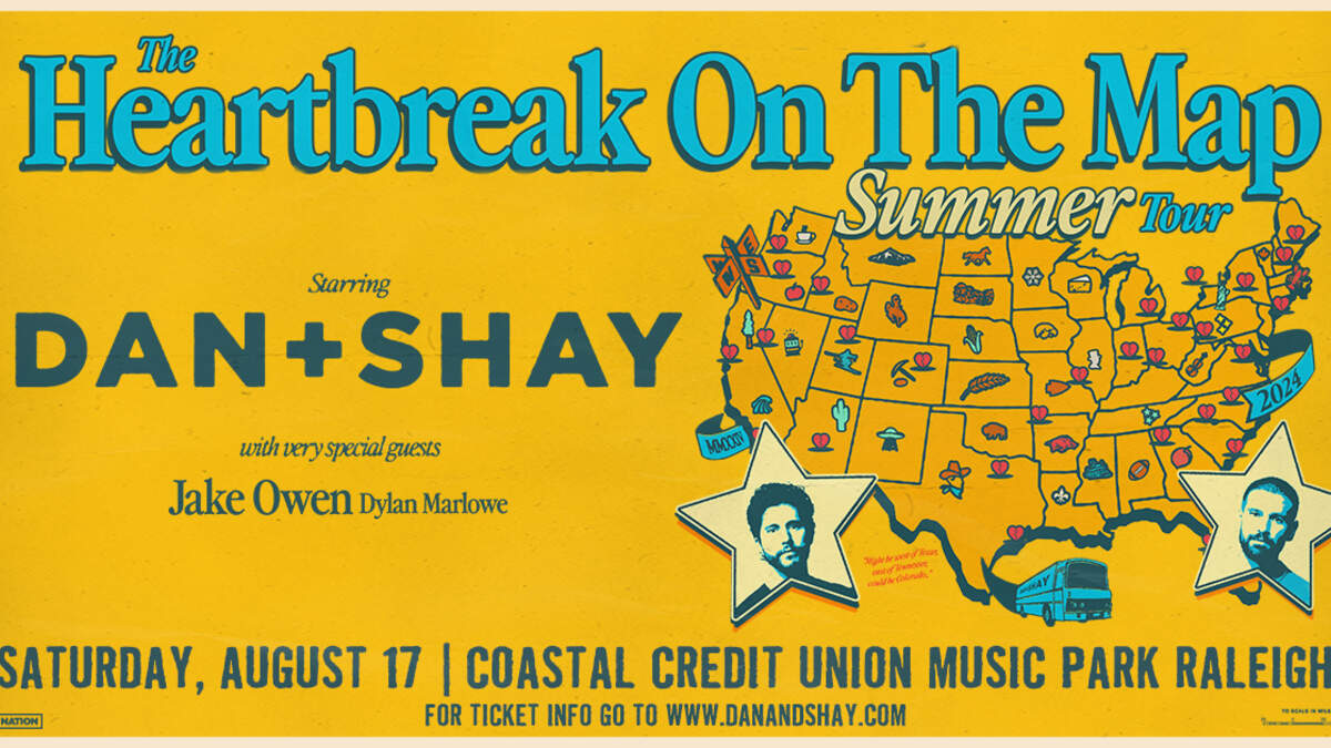 💔🗺️ Don't miss Dan + Shay’s Heartbreak On The Map Tour!! With Jake Owen and Dylan Marlowe! Coming to Coastal Credit Union Music Park Raleigh Saturday 8/17!